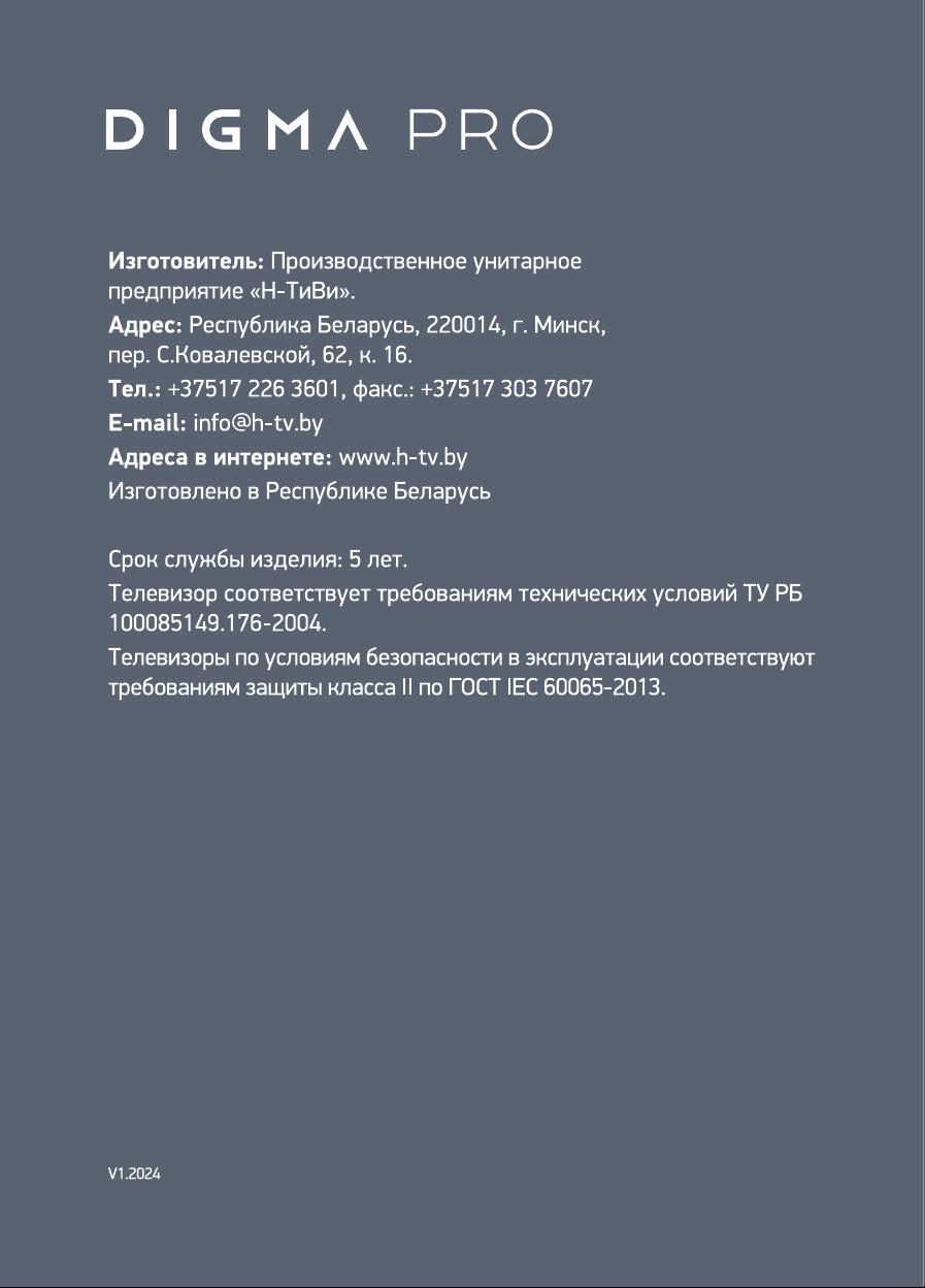 Данная инструкция на русском языке предназначена для телевизора Digma Pro OLED 65M, описывает принцип работы и основные моменты эксплуатации устройства. Перед первым включением рекомендуется внимательно изучить данное руководство.