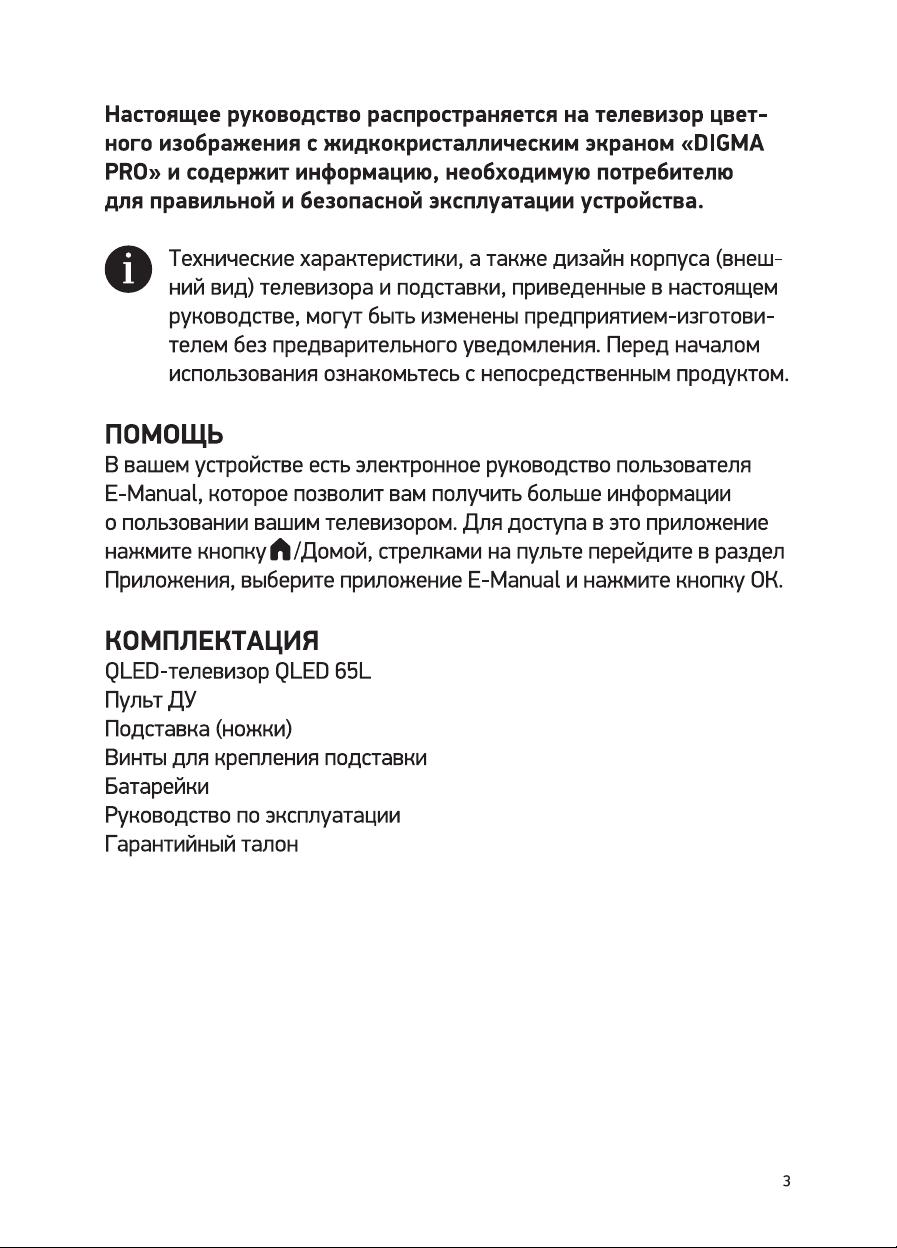 Данная инструкция на русском языке предназначена для телевизора Digma Pro QLED 65L, описывает принцип работы и основные моменты эксплуатации устройства. Перед первым включением рекомендуется внимательно изучить данное руководство.