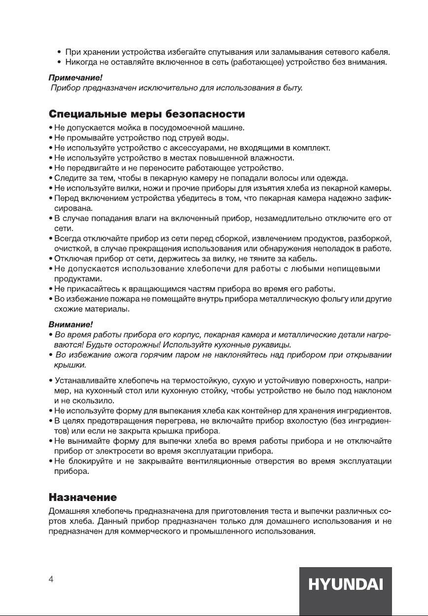 Данная инструкция на русском языке предназначена для хлебопечки Hyundai HYBM-P0212, описывает принцип работы и основные моменты эксплуатации устройства. Перед первым включением рекомендуется внимательно изучить данное руководство.