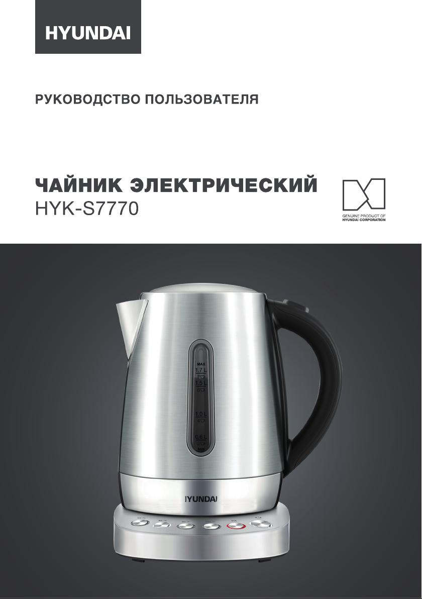 Данная инструкция на русском языке предназначена для чайника Hyundai HYK-S7770, описывает принцип работы и основные моменты эксплуатации устройства. Перед первым включением рекомендуется внимательно изучить данное руководство.