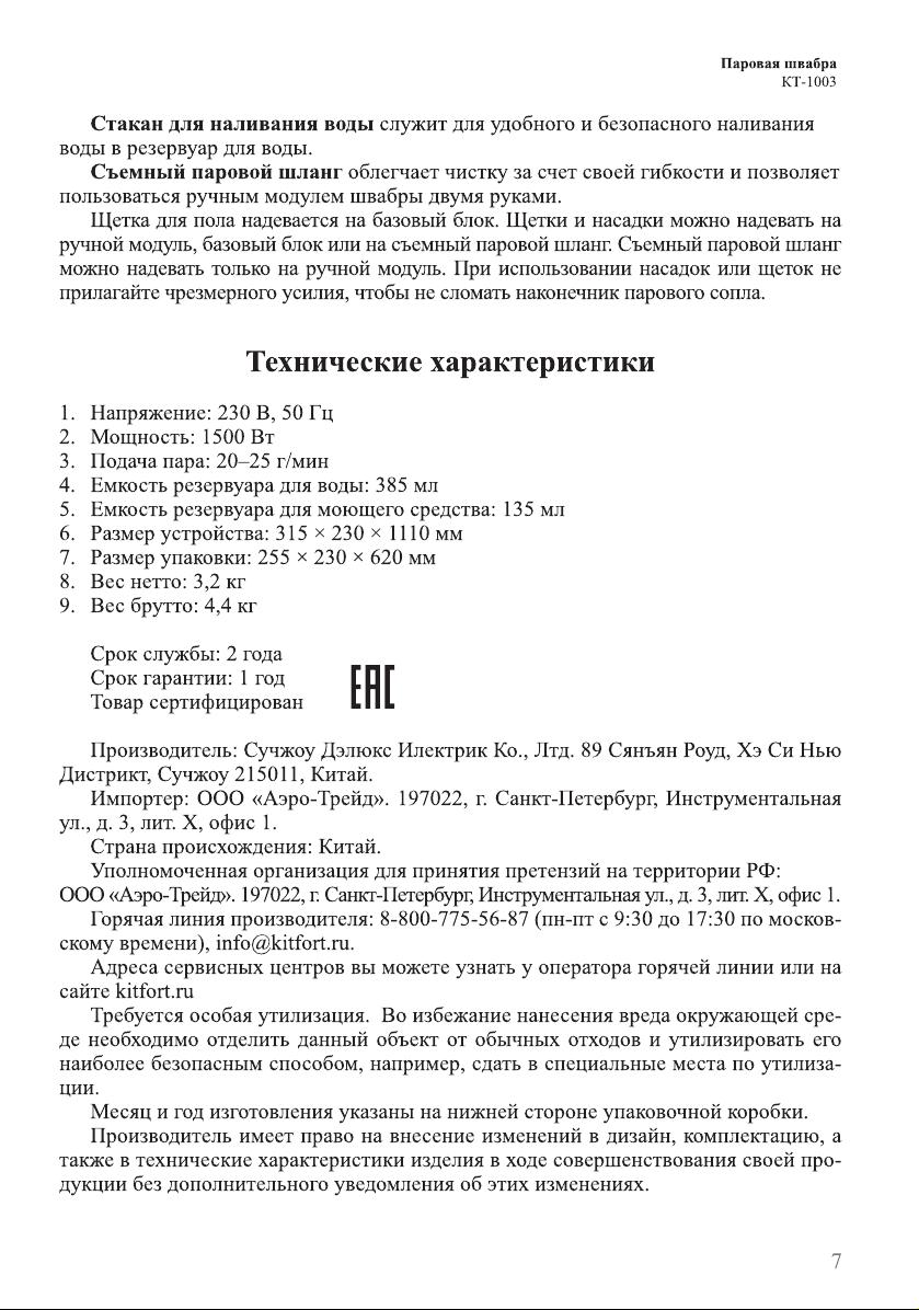 Данная инструкция на русском языке предназначена для паровой швабры Kitfort KT-1003, описывает принцип работы и основные моменты эксплуатации устройства. Перед первым включением рекомендуется внимательно изучить данное руководство.