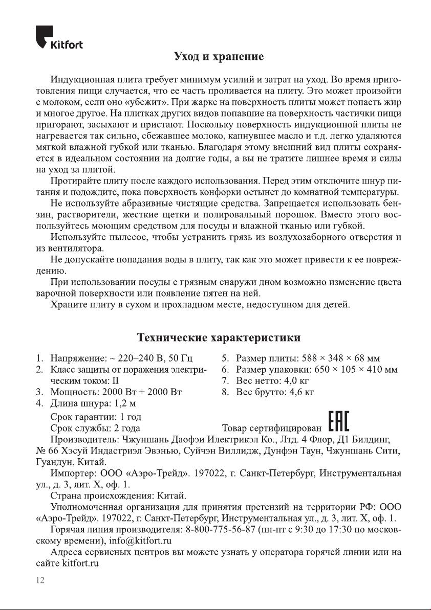 Данная инструкция на русском языке предназначена для плиты Kitfort KT-109, описывает принцип работы и основные моменты эксплуатации устройства. Перед первым включением рекомендуется внимательно изучить данное руководство.