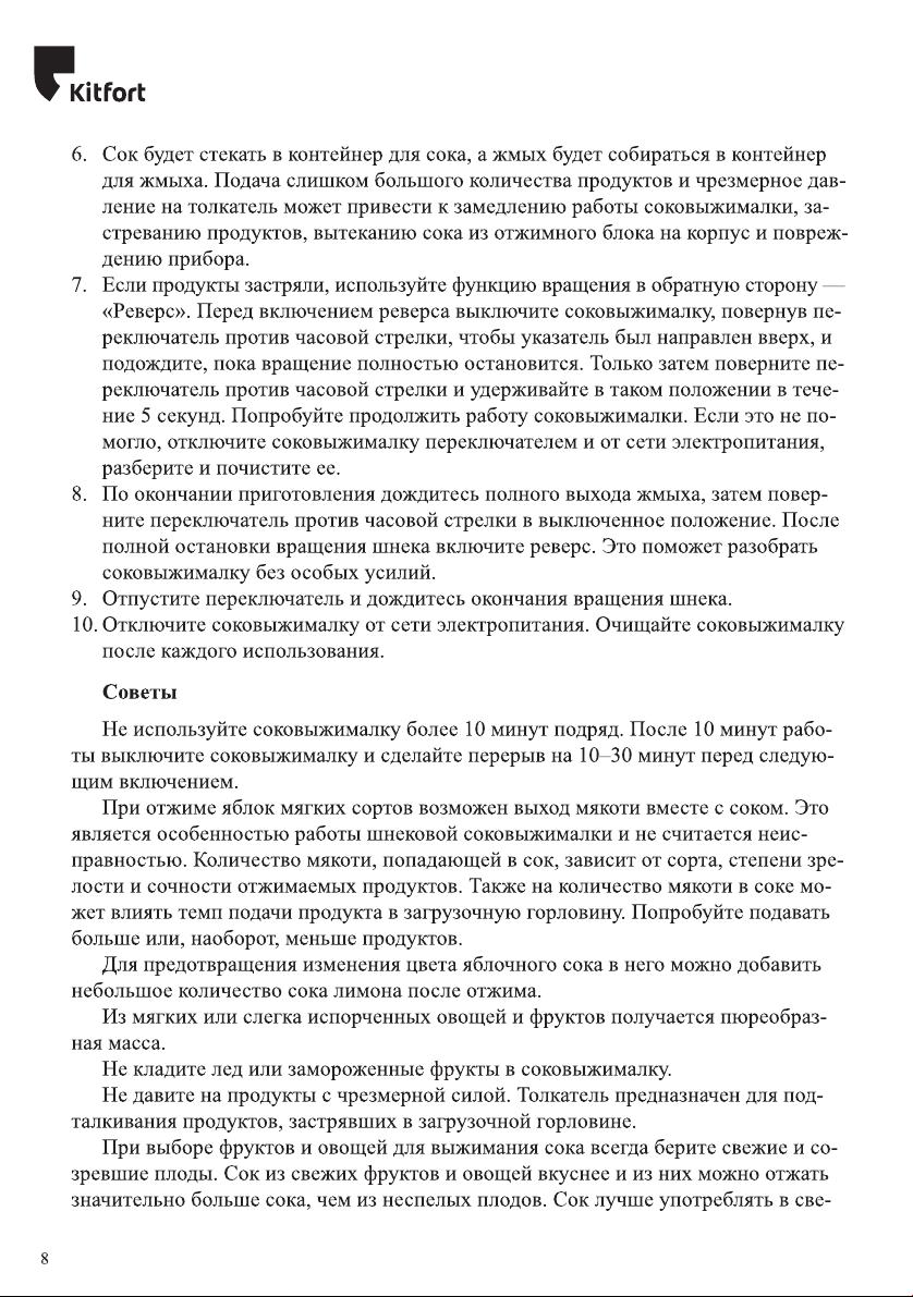 Данная инструкция на русском языке предназначена для соковыжималки Kitfort KT-1146, описывает принцип работы и основные моменты эксплуатации устройства. Перед первым включением рекомендуется внимательно изучить данное руководство.