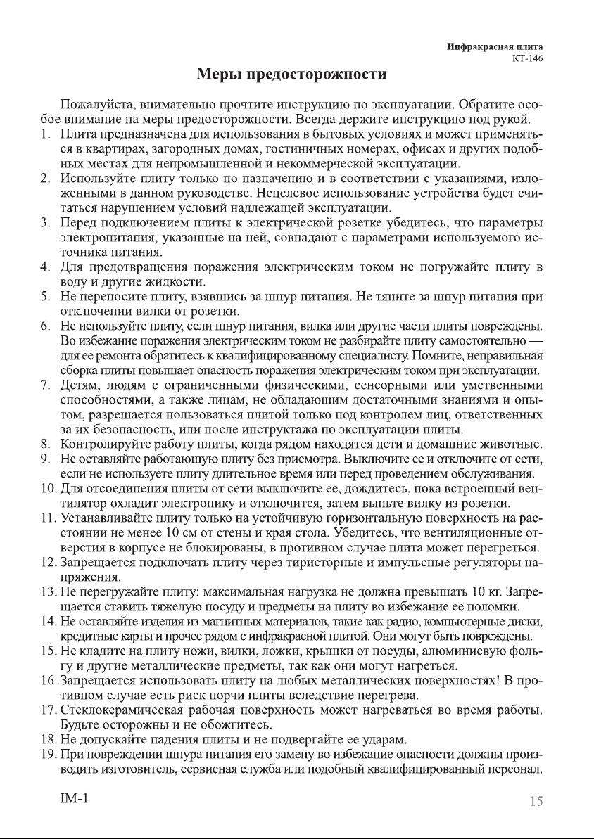 Данная инструкция на русском языке предназначена для плиты Kitfort KT-146, описывает принцип работы и основные моменты эксплуатации устройства. Перед первым включением рекомендуется внимательно изучить данное руководство.