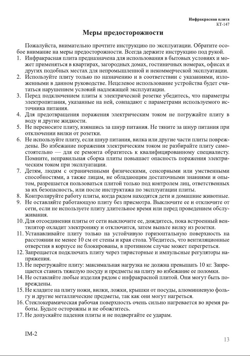 Данная инструкция на русском языке предназначена для плиты Kitfort KT-147, описывает принцип работы и основные моменты эксплуатации устройства. Перед первым включением рекомендуется внимательно изучить данное руководство.