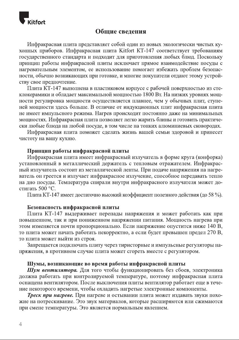 Данная инструкция на русском языке предназначена для плиты Kitfort KT-147, описывает принцип работы и основные моменты эксплуатации устройства. Перед первым включением рекомендуется внимательно изучить данное руководство.