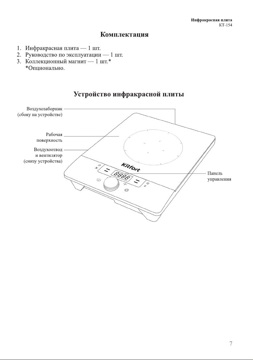 Данная инструкция на русском языке предназначена для плиты Kitfort KT-154, описывает принцип работы и основные моменты эксплуатации устройства. Перед первым включением рекомендуется внимательно изучить данное руководство.