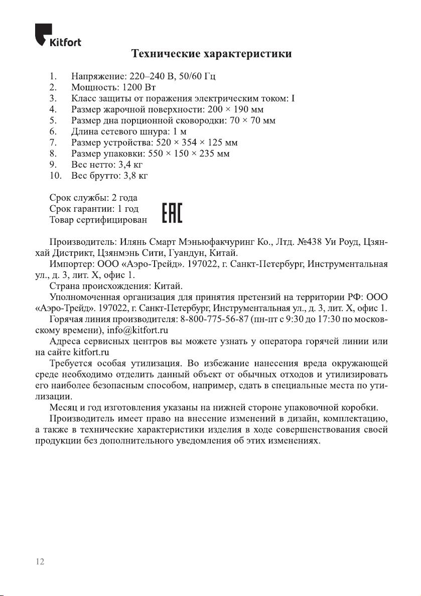 Данная инструкция на русском языке предназначена для гриля Kitfort KT-1647, описывает принцип работы и основные моменты эксплуатации устройства. Перед первым включением рекомендуется внимательно изучить данное руководство.