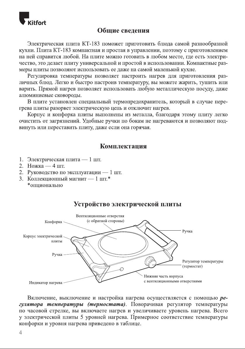 Данная инструкция на русском языке предназначена для плиты Kitfort KT-183, описывает принцип работы и основные моменты эксплуатации устройства. Перед первым включением рекомендуется внимательно изучить данное руководство.