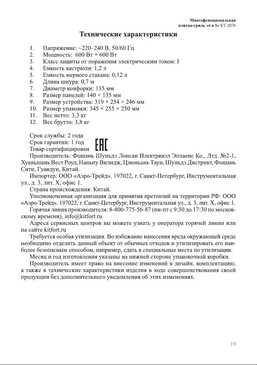 Данная инструкция на русском языке предназначена для плиты Kitfort KT-2076, описывает принцип работы и основные моменты эксплуатации устройства. Перед первым включением рекомендуется внимательно изучить данное руководство.