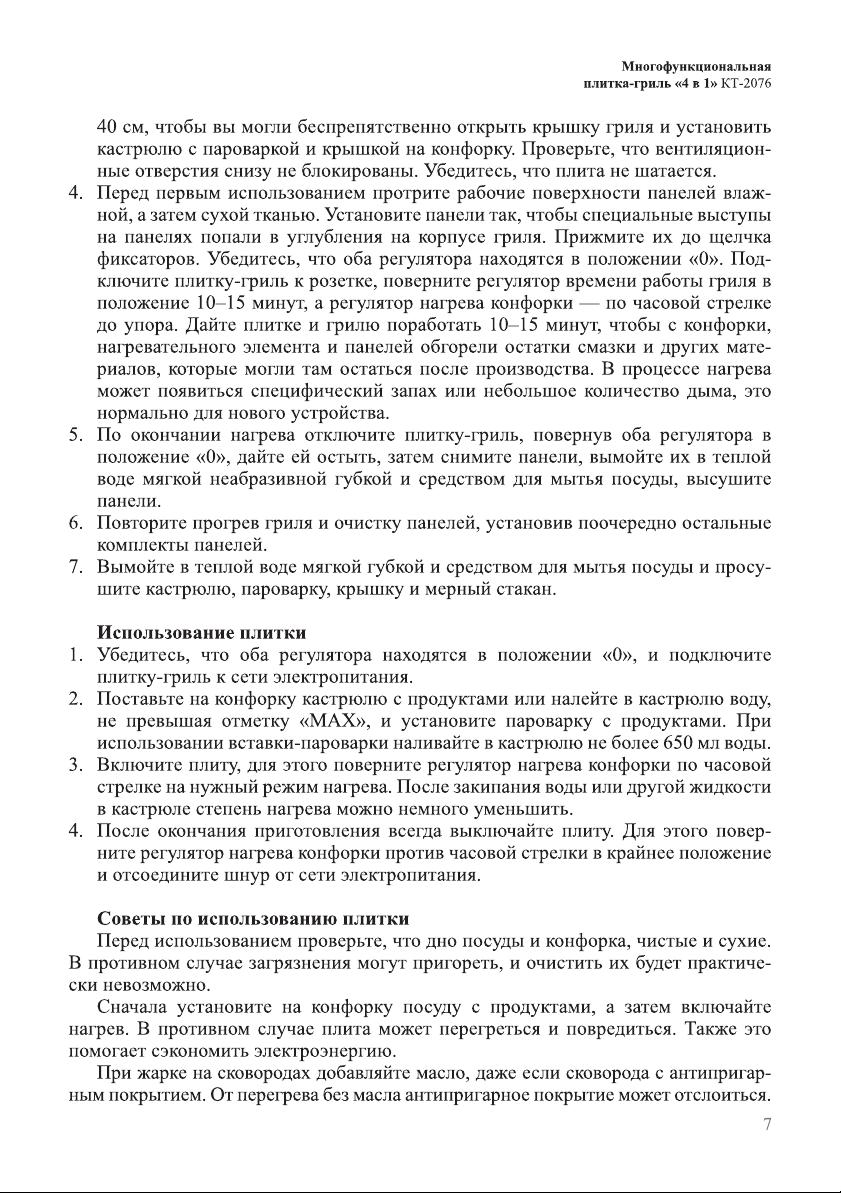 Данная инструкция на русском языке предназначена для плиты Kitfort KT-2076, описывает принцип работы и основные моменты эксплуатации устройства. Перед первым включением рекомендуется внимательно изучить данное руководство.