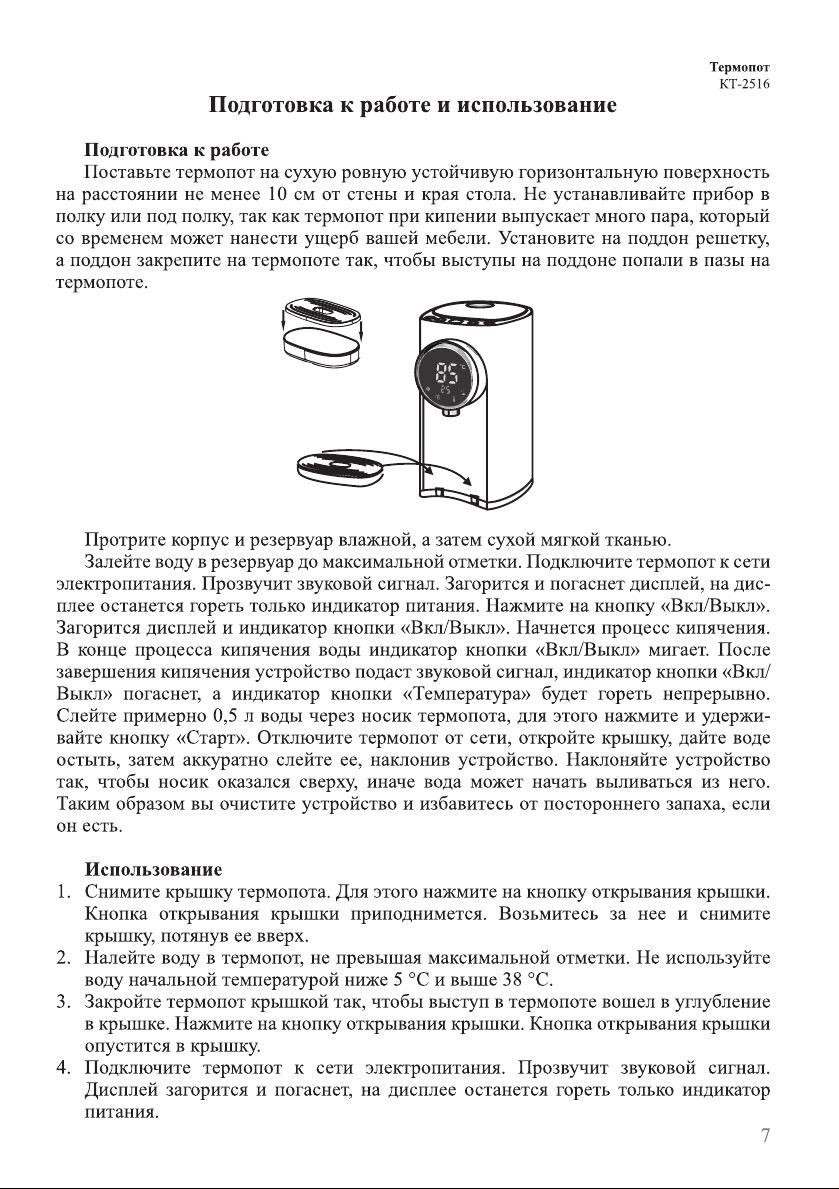Данная инструкция на русском языке предназначена для термопота Kitfort KT-2516, описывает принцип работы и основные моменты эксплуатации устройства. Перед первым включением рекомендуется внимательно изучить данное руководство.