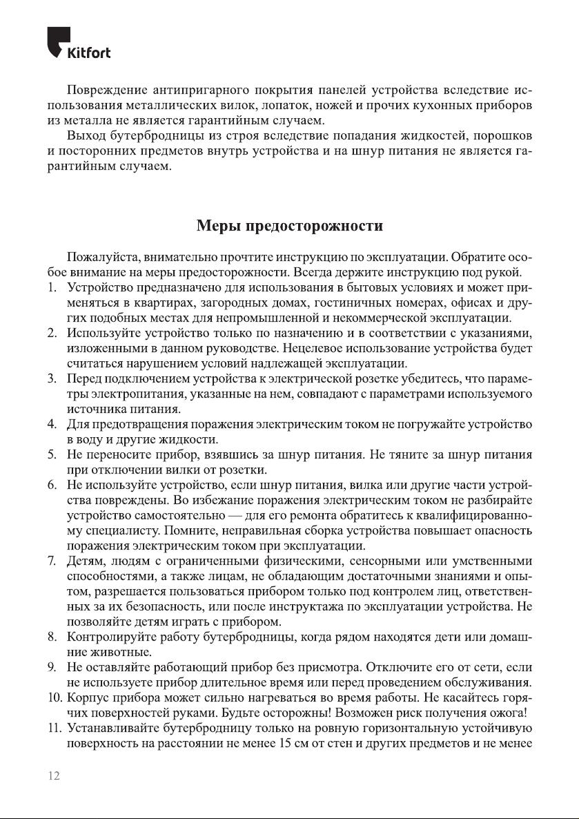 Данная инструкция на русском языке предназначена для бутербродницы Kitfort KT-3663, описывает принцип работы и основные моменты эксплуатации устройства. Перед первым включением рекомендуется внимательно изучить данное руководство.