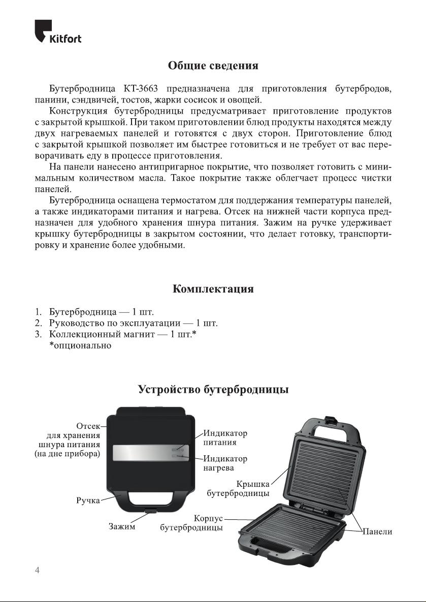 Данная инструкция на русском языке предназначена для бутербродницы Kitfort KT-3663, описывает принцип работы и основные моменты эксплуатации устройства. Перед первым включением рекомендуется внимательно изучить данное руководство.