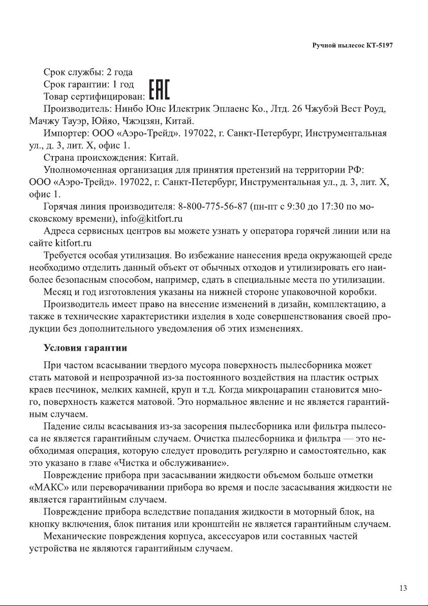Данная инструкция на русском языке предназначена для пылесоса Kitfort KT-5197, описывает принцип работы и основные моменты эксплуатации устройства. Перед первым включением рекомендуется внимательно изучить данное руководство.