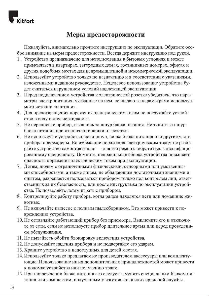 Данная инструкция на русском языке предназначена для пылесоса Kitfort KT-5197, описывает принцип работы и основные моменты эксплуатации устройства. Перед первым включением рекомендуется внимательно изучить данное руководство.