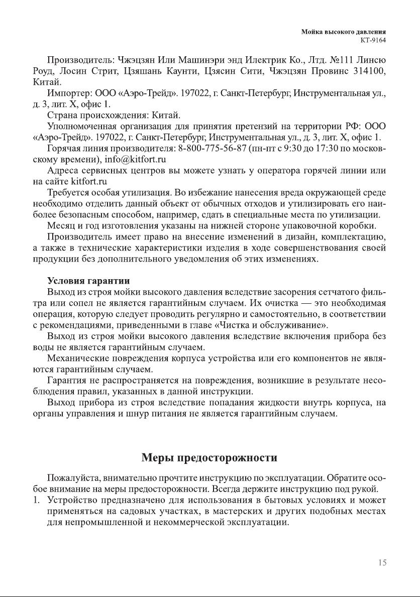 Данная инструкция на русском языке предназначена для мойки высокого давления Kitfort KT-9164, описывает принцип работы и основные моменты эксплуатации устройства. Перед первым включением рекомендуется внимательно изучить данное руководство.