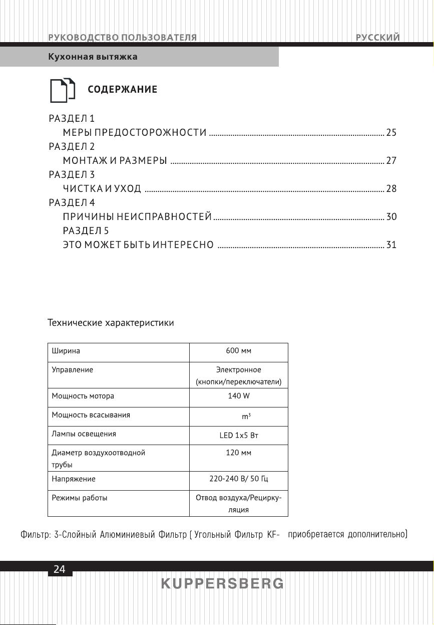 Данная инструкция на русском языке предназначена для вытяжки Kuppersberg F 605, описывает принцип работы и основные моменты эксплуатации устройства. Перед первым включением рекомендуется внимательно изучить данное руководство.