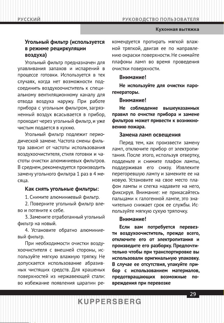 Данная инструкция на русском языке предназначена для вытяжки Kuppersberg F 605, описывает принцип работы и основные моменты эксплуатации устройства. Перед первым включением рекомендуется внимательно изучить данное руководство.