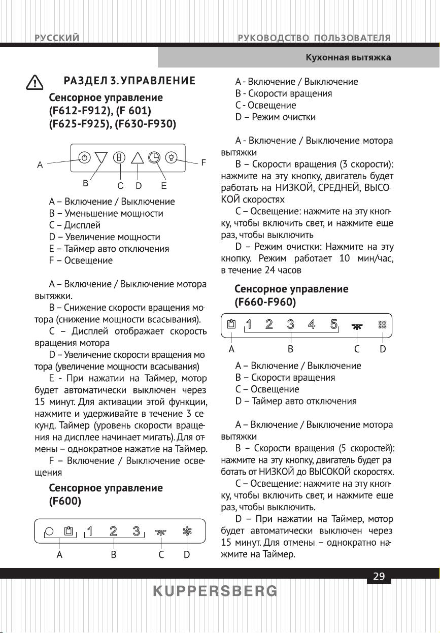 Данная инструкция на русском языке предназначена для вытяжки Kuppersberg F 693, описывает принцип работы и основные моменты эксплуатации устройства. Перед первым включением рекомендуется внимательно изучить данное руководство.