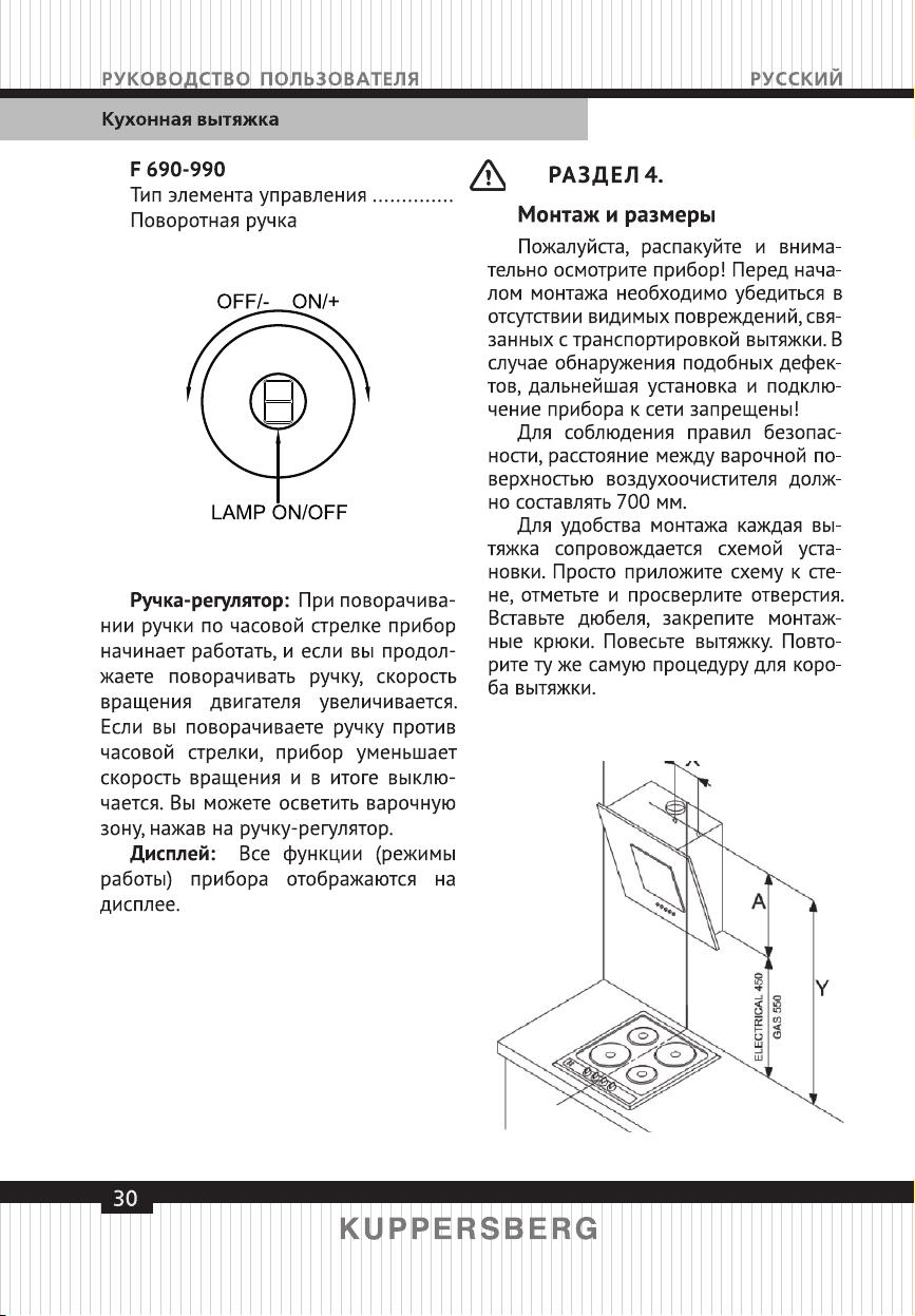Данная инструкция на русском языке предназначена для вытяжки Kuppersberg F 993, описывает принцип работы и основные моменты эксплуатации устройства. Перед первым включением рекомендуется внимательно изучить данное руководство.
