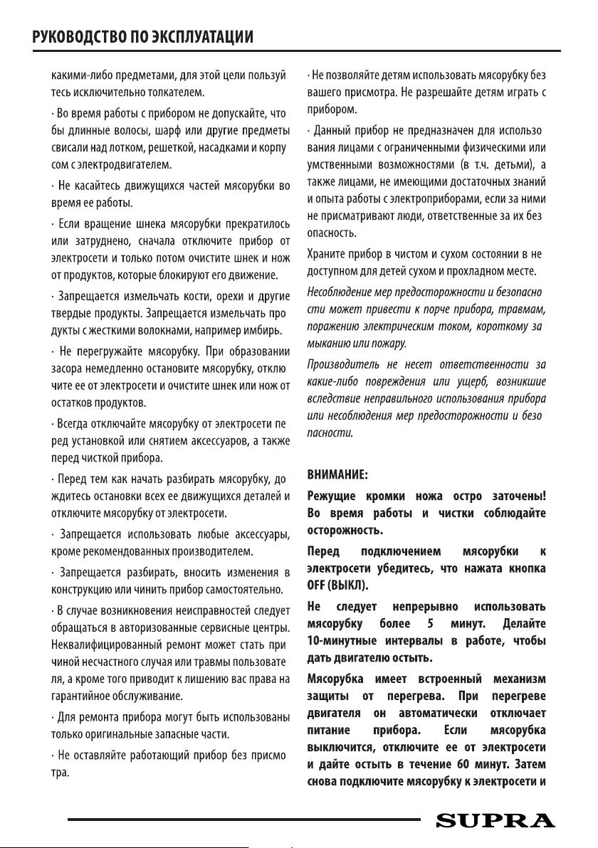 Данная инструкция на русском языке предназначена для мясорубки SUPRA MGS-2006, описывает принцип работы и основные моменты эксплуатации устройства. Перед первым включением рекомендуется внимательно изучить данное руководство.