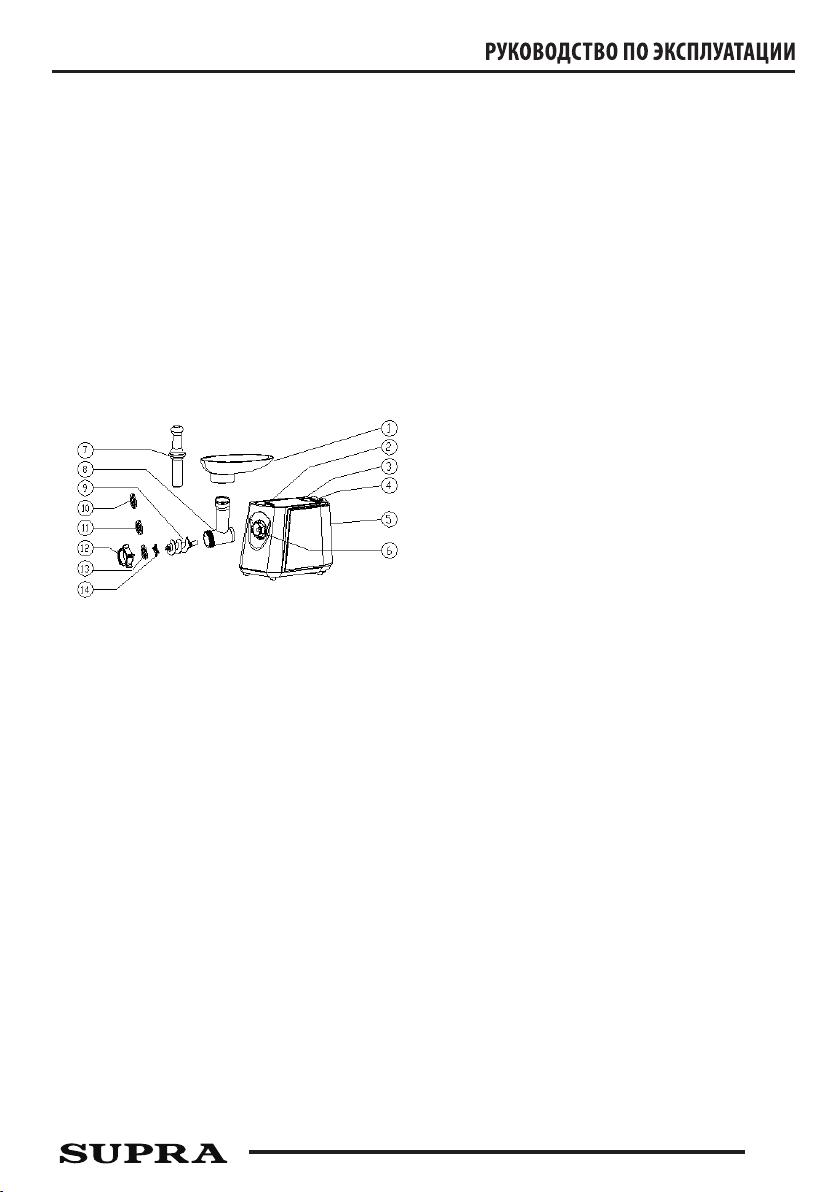 Данная инструкция на русском языке предназначена для мясорубки SUPRA MGS-2091, описывает принцип работы и основные моменты эксплуатации устройства. Перед первым включением рекомендуется внимательно изучить данное руководство.