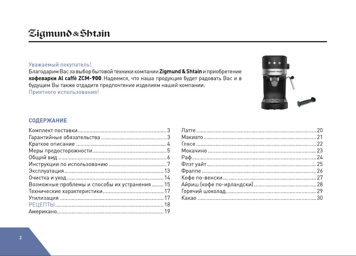 Данная инструкция на русском языке предназначена для кофемашины Zigmund & Shtain Al caffe ZCM-900, описывает принцип работы и основные моменты эксплуатации устройства. Перед первым включением рекомендуется внимательно изучить данное руководство.