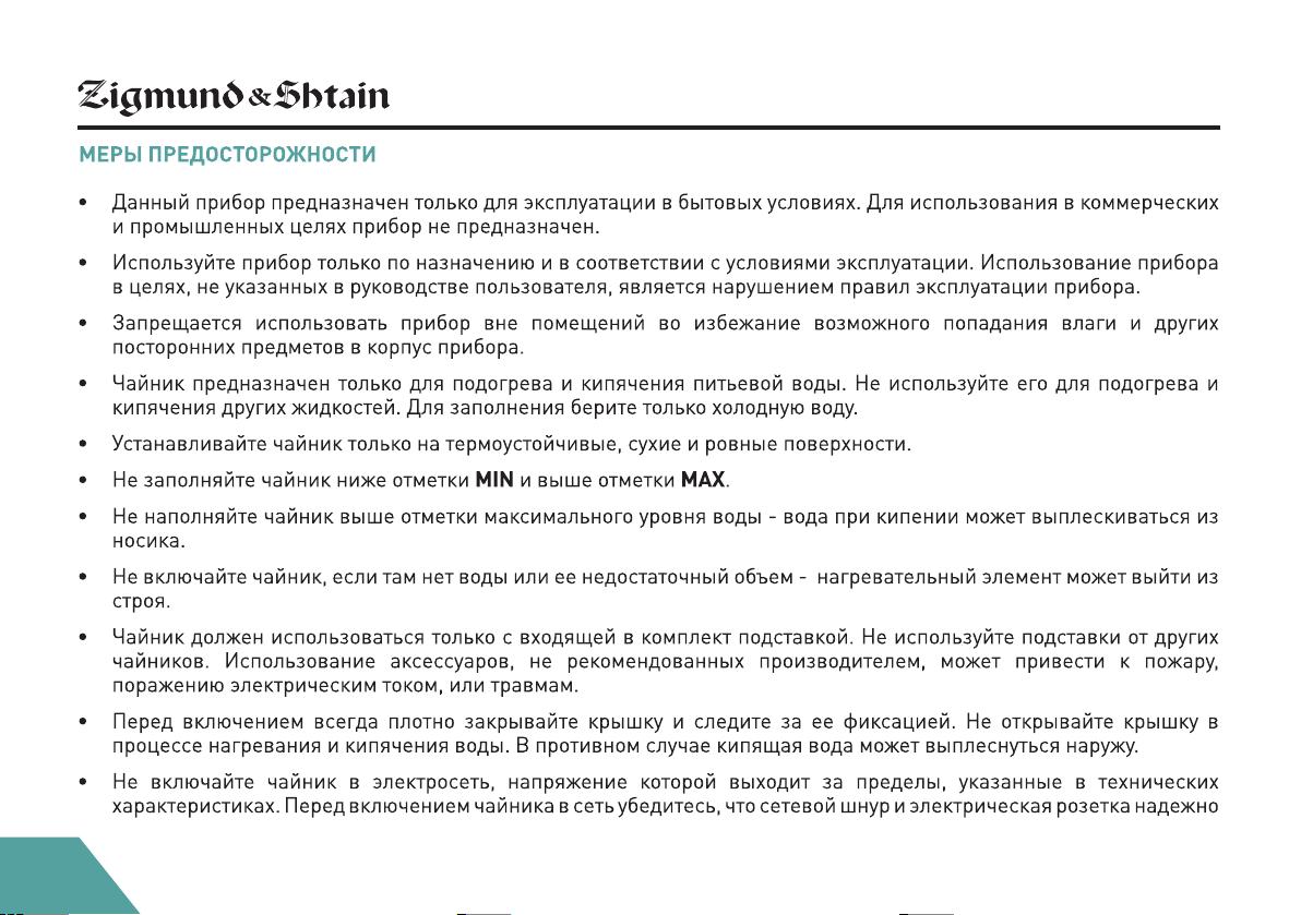 Данная инструкция на русском языке предназначена для чайника Zigmund & Shtain KE-83 SD, описывает принцип работы и основные моменты эксплуатации устройства. Перед первым включением рекомендуется внимательно изучить данное руководство.